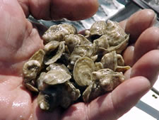 There are often dozens of spat that attach themselves to a small area that is suitable. But as they grow, few of these will survive. As the oyster grows, so does it's shell. The condition of the environment decides the shape that the oyster takes. Crowded conditions produce long, narrow shells whereas open and unrestricted conditions produce the higher-quality round shells. Within four to six years, the oyster will reach the three inches that's required to make it a legal size for fishing.